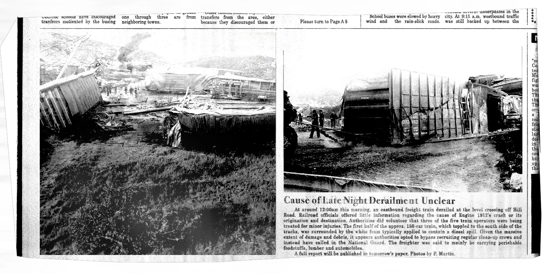 The train was allegedly carrying perishable foodstuffs, lumber and 1980s model autos. Coverage and photos appeared in several newspapers. Depending on the paper, the damage was inexplicably reported anywhere from $2 million to $10 million dollars. The average cost of train derailments in the 1970s was only around $50,000. An article from June of 1979, that probably escaped government censor because it appeared in a small circulation local paper, describes a similar, and likely the real accident. The Train Order shown at right puts engine 1912 coming out of Monon prior to the accident reported in the local paper listed above. Despite being even larger, and allegedly carrying the same type of cargo, this wreck was not even covered in any other newspaper or medium. Also, the article mentions the necessity of the National Guard given the size of the cleanup, but the train must’ve been carrying something far more sensitive than food and wood to have created such an official stir.