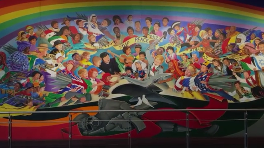 The New World Order conspiracy thickens with a mural of a soldier wearing a gas mask and carrying an AK-47 in one hand, and a scimitar in the other. The scimitar is shown stabbing a dove which is a symbol of peace. Many believe this is supposed to be symbolism for the establishment of a New World Order or an act of genocide.